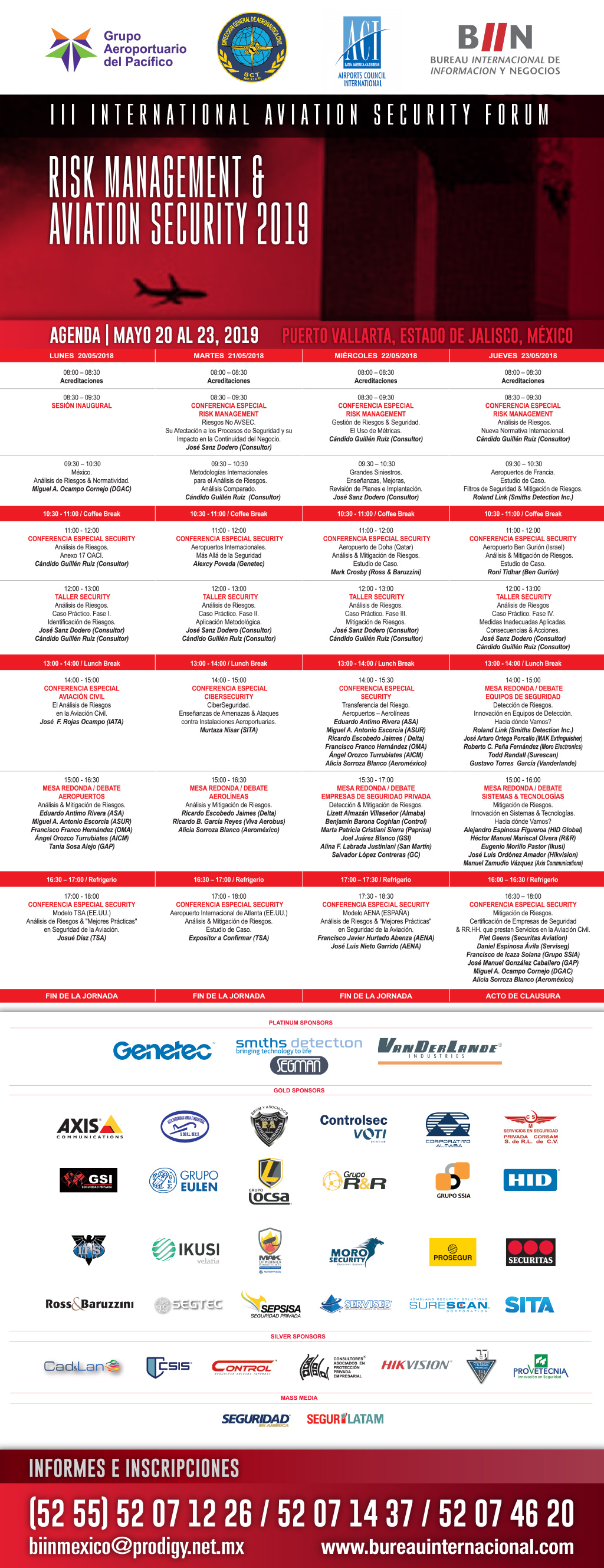 El Programa – previsto para los días 20 al 23 de Mayo próximo en Puerto Vallarta (Estado de Jalisco, México) – será impartido por Representantes de las Autoridades Aeronáuticas de EE.UU. y Europa, Canadá y México, Consultores Internacionales de reconocido prestigio, directivos de Aerolíneas, de los distintos Grupos y Operadores Aeroportuarios, ejecutivos de firmas proveedoras de equipos, sistemas y tecnologías y, empresas prestadoras de servicios de seguridad, oportunidad en la que habrán de impartirse una serie de conferencias, talleres y mesas redondas que permitirán un intenso intercambio de experiencias y puntos de vista entre funcionarios aeroportuarios, gestores, líneas aéreas, proveedores y compañías de servicios.